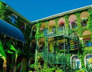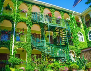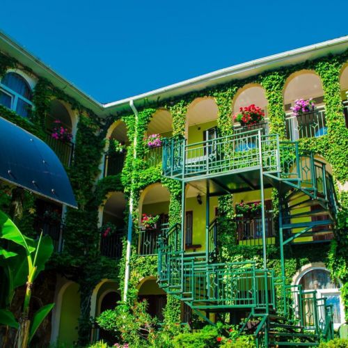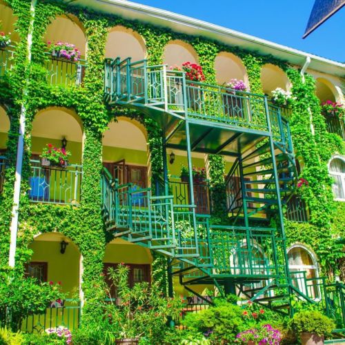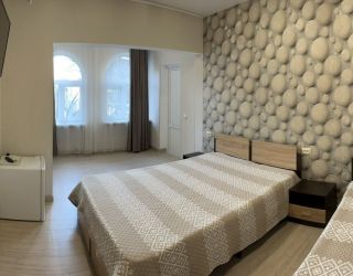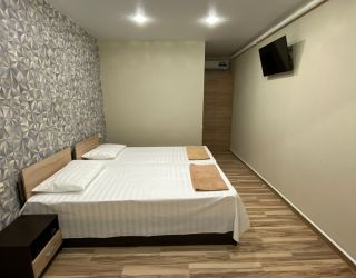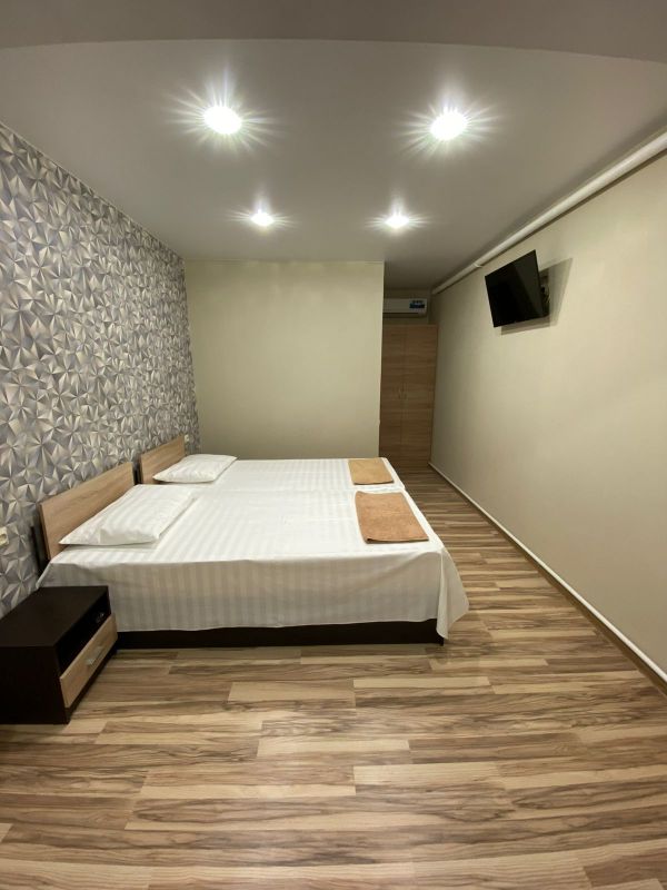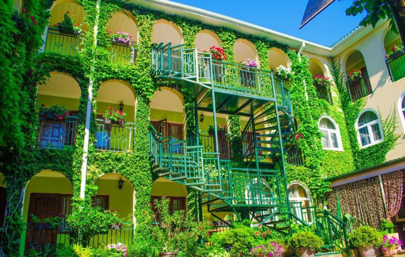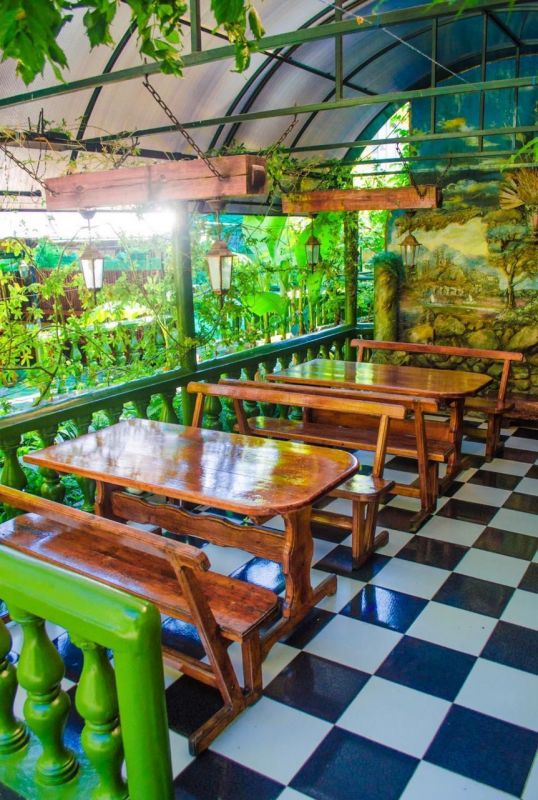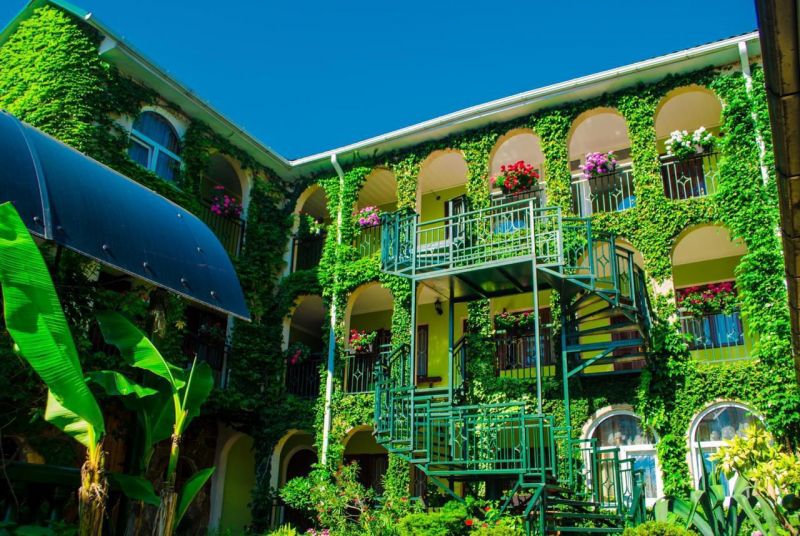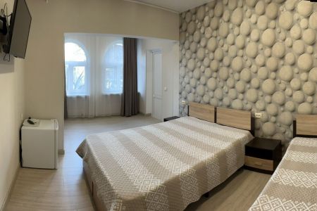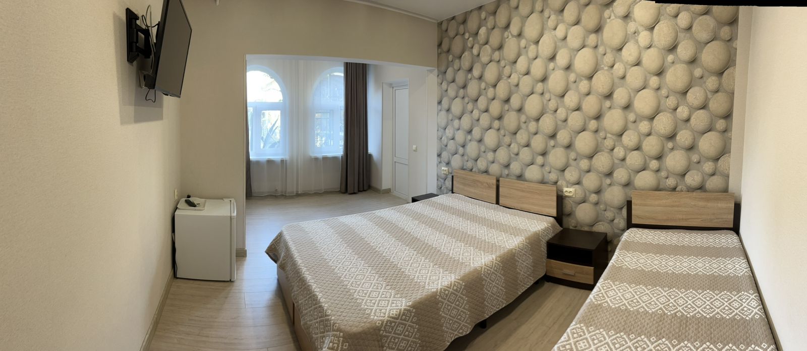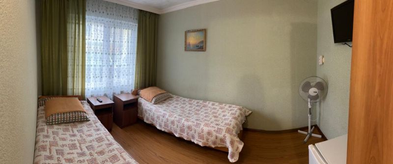 Трехэтажный корпус гостевого дома находится на закрытой территории, расположенной среди частого сектора. Уютный внутренний дворик, фасады гостевого дома, летние беседки красиво оплетены виноградной лозой. Жилой фонд, рассчитанный на 60 человек, предлагает гостям двухместные номера Стандарт. В каждом номере есть отдельный санузел с душем, кондиционер, телевизор, в некоторых комнатах имеются балконы.